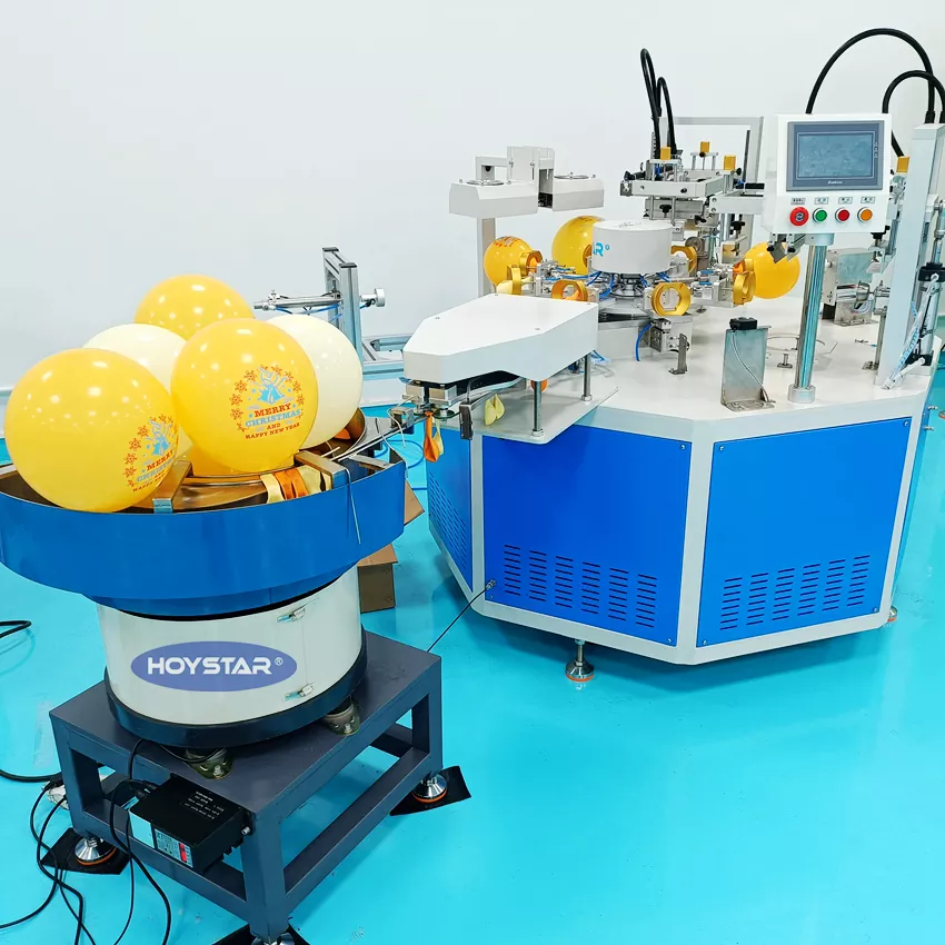 HOYSTAR este un producător și furnizor de încredere în China; Această mașină de serigrafiat cu baloane de culoare HOYSTAR 2 cu alimentator automat este proiectată pentru imprimarea pe baloane din latex. Echipat cu masa de lucru rotativa, incarcare automata, suflare automata, rotire automata, uscare automata, functii de descarcare automata. Control cu ecran tactil PLC, interfață ușor de utilizat pentru o operare sigură și intuitivă. Aparatul combină viteza, precizia și ușurința în utilizare.