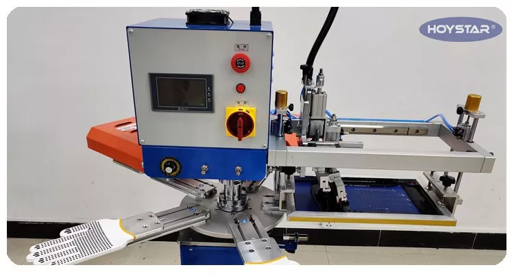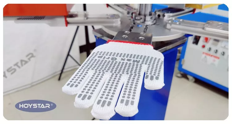 În calitate de producător și furnizor profesionist, mașina de imprimare serigrafică cu mănuși antiderapante HOYSTAR este proiectată pentru aplicații în industria de tricotat textil. Cu o viteză de până la 1000PCS/Hr, este potrivit pentru imprimarea mănușilor de lucru, mănușilor de bumbac, mănușilor tricotate etc. Echipat cu masă de lucru rotativă, este foarte convenabil să încărcați și descărcați mănuși. Control cu ecran tactil PLC, foarte ușor de operat. Mașina echipată cu sistem de uscare poate usca bine siliconul și cerneala.